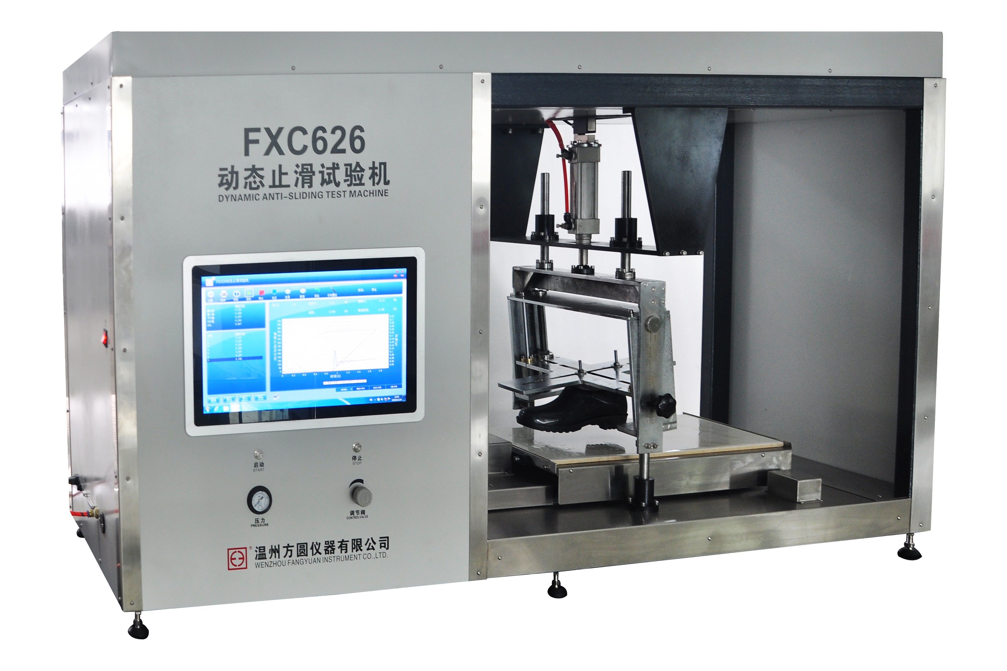 用途:本試驗機用于測試鞋子的止滑性能,通過測試出試樣鞋鞋底各部位的摩擦系數,以判定其止滑性。
